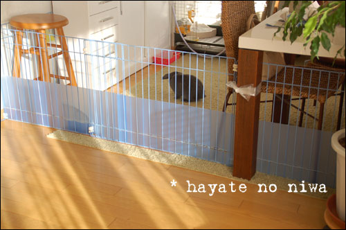 こんな具合に青いサークルフェンスと白いフェンスを二重にして(フェンス越しでさえ、疾風が噛まれそうで怖かったから)、