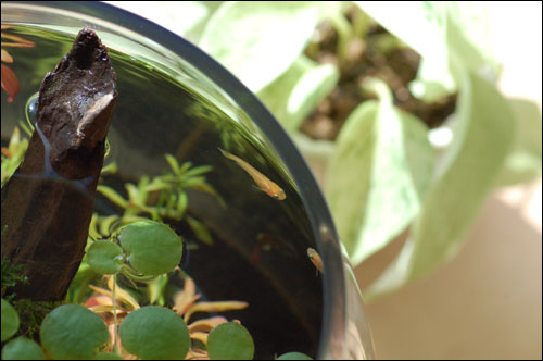 魚といえど、初めての環境に戸惑いつつ徐々に探索している姿は愛らしいですし、何と言っても笑えたのは、先住のアカヒレがものすごく驚いていて、メダカに「おまえなに?」「あんた誰?」といちいち聞いて回っている姿でした。