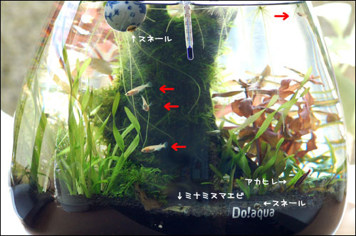 アカヒレ1、メダカ6、ミナミヌマエビ5、スネール数匹は、Do!aquaのオーバル25(容器)にはちょっと多いかもしれませんが、2日間様子を見ている感じでは何とか大丈夫そうです。