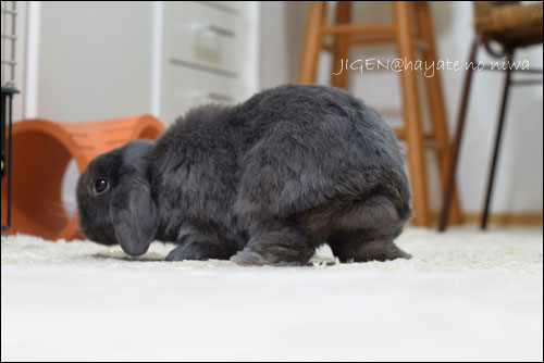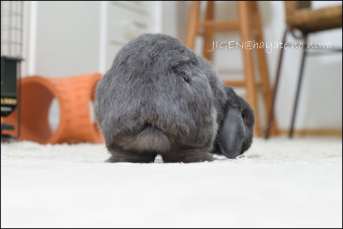 昔、本か何かでうさぎさんは仲間に外敵が来たことを知らせるために、しっぽの裏側は白いとみた記憶があります。ぼんちーのしっぽは背中にぴとってくっつくと白いのがみえますが、じーくんは見えますか?