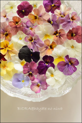 ベランダで咲いているビオラの花を摘んで水に浮かべました。
